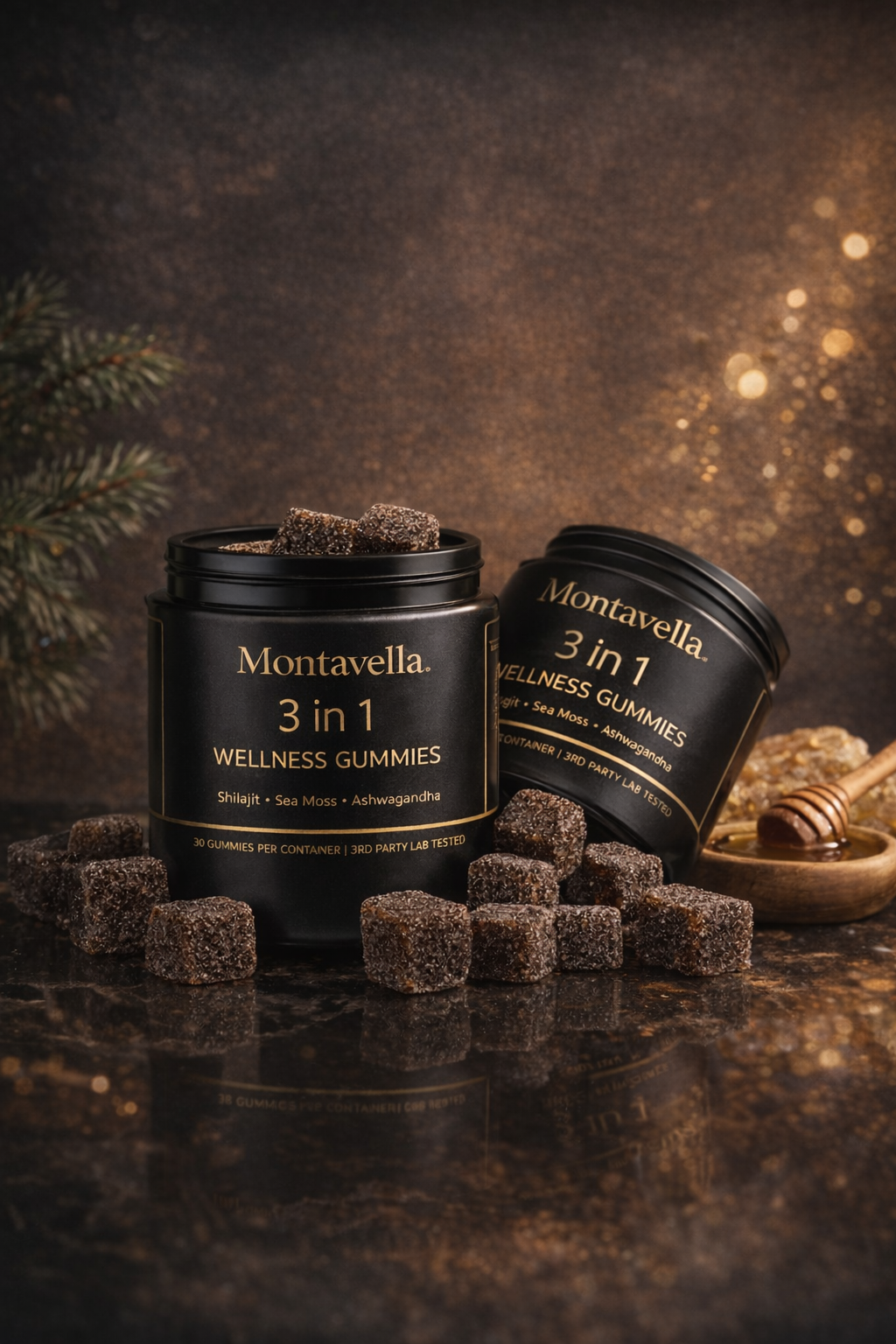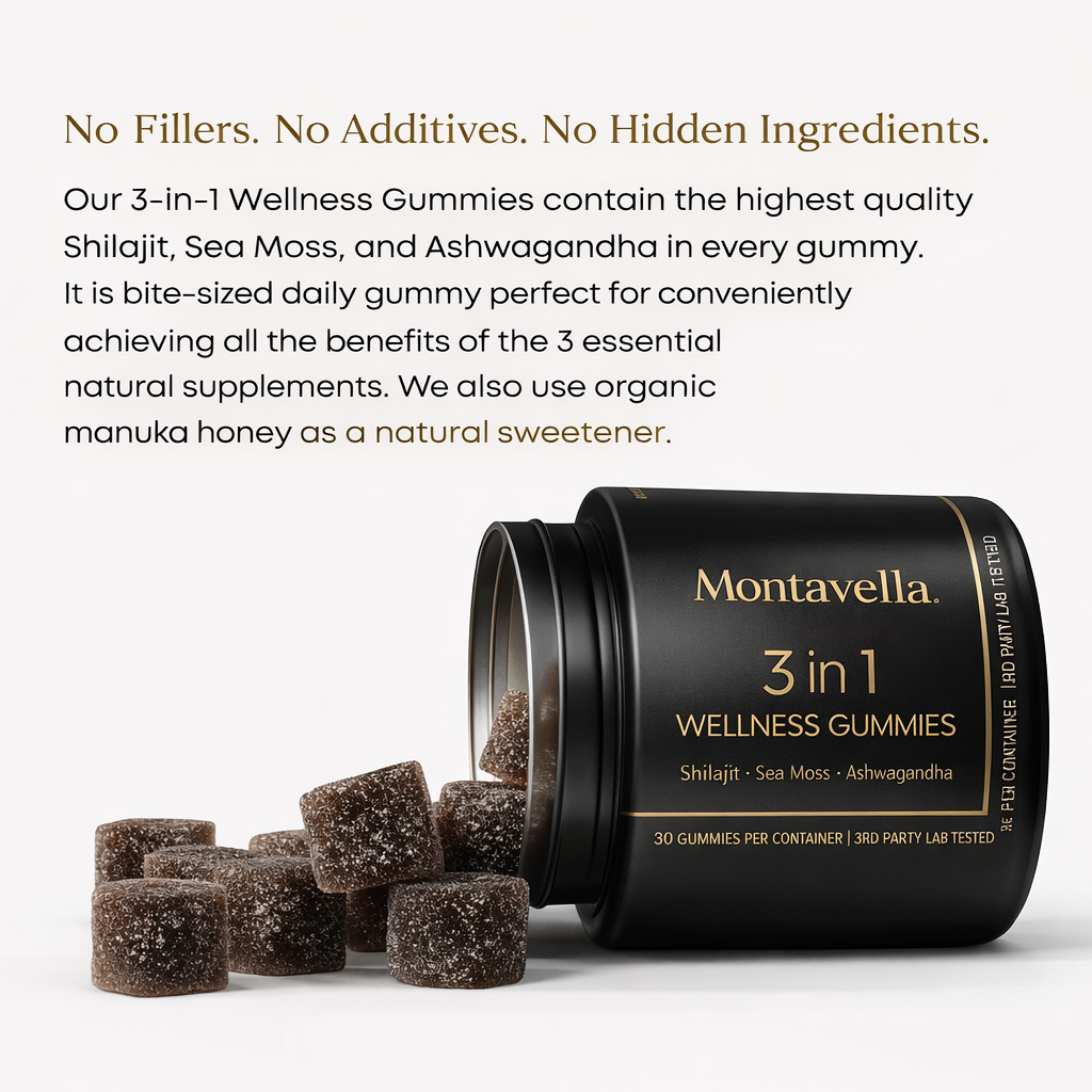 Trusted by customers looking for a simpler approach to daily wellness, Montavella 3-in-1 Wellness Gummies combine Shilajit, Sea Moss, and Ashwagandha into one convenient and great-tasting formula. Designed to support energy, balance, and overall well-being, each gummy delivers carefully selected ingredients in an easy, consistent daily dose.